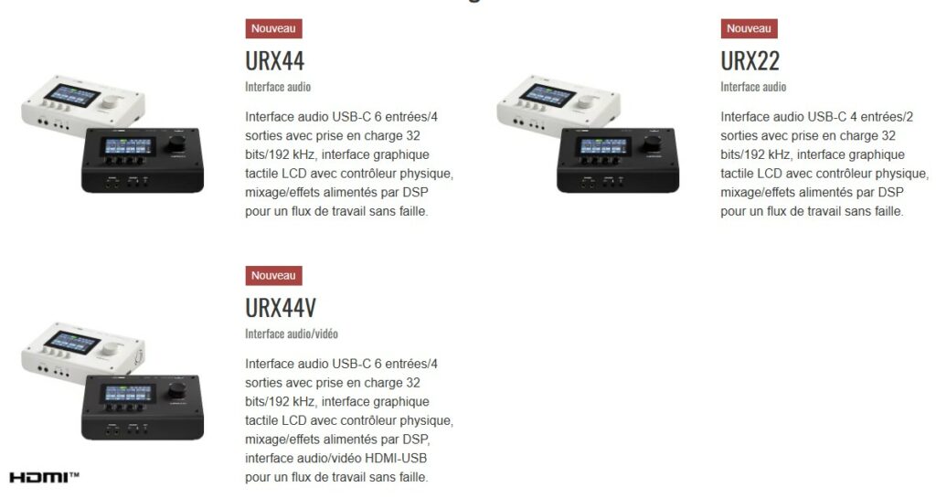 La série URX est une interface audio USB professionnelle offrant des performances audio exceptionnelles, avec une prise en charge du 32 bits / 192 kHz, une plage dynamique de 115 dB (entrée) / 125 dB (sortie principale) et un fonctionnement ultra-silencieux. Elle intègre également des fonctions de mixage, de routage et de traitement du signal équivalentes à celles de la série MGX. Le modèle URX44V dispose en outre d’une interface vidéo/audio HDMI-USB.